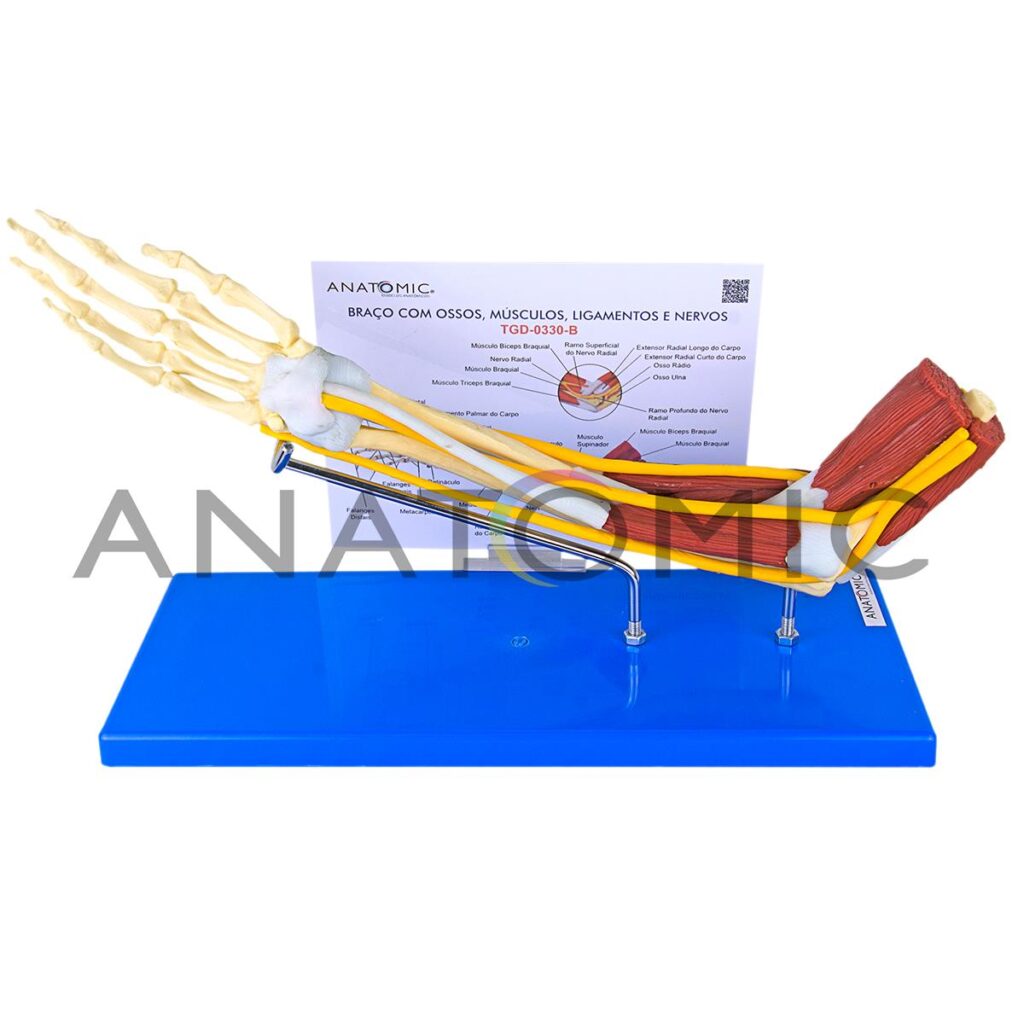 Modelo anatômico de membro superior (antebraço), exibe ossos, músculos e nervos. Ideal para auxiliar os estudos de anatomia.