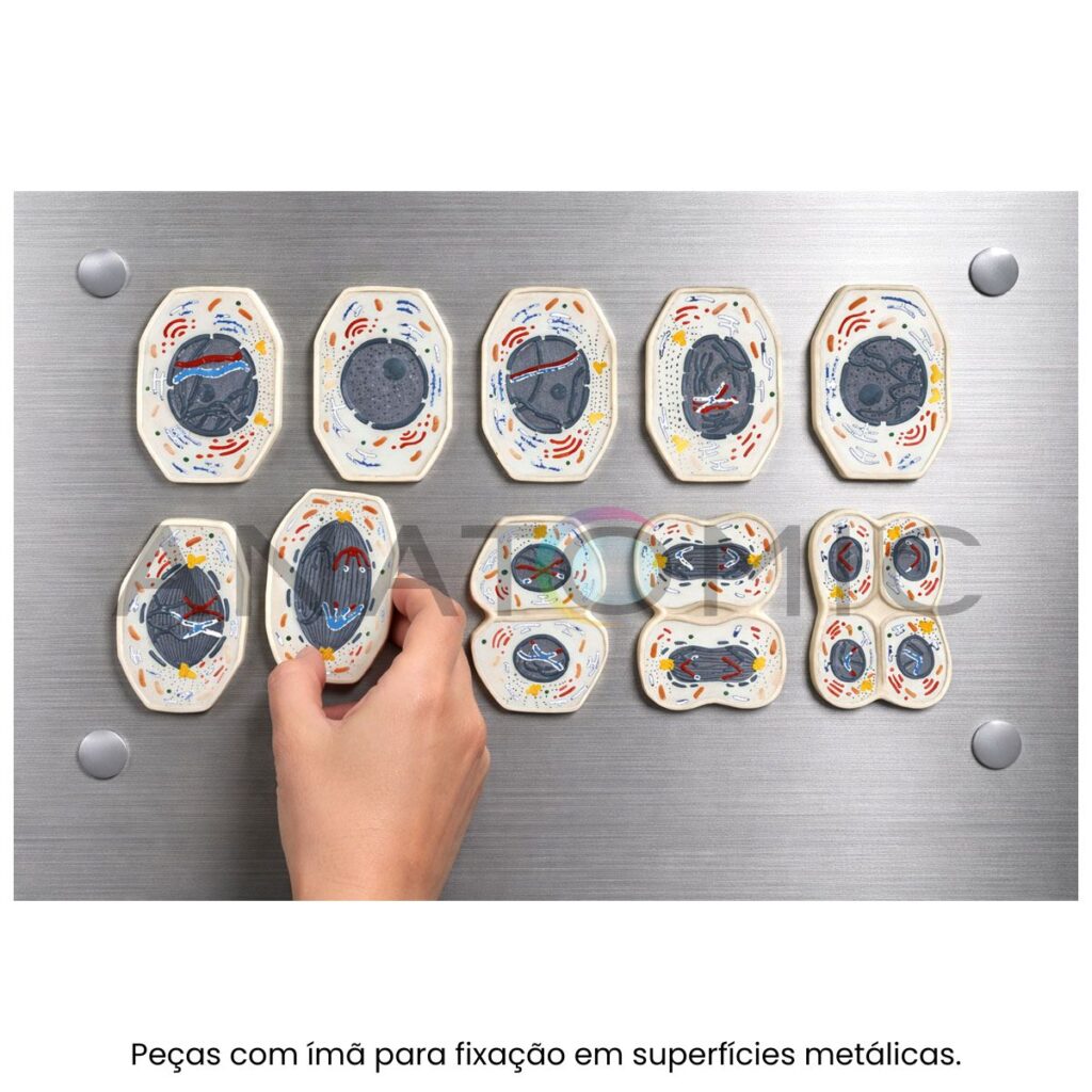 Modelo ampliando 10.000 vezes, apresenta conjunto com 10 peças, ilustrando os estágios da meiose; possui cores comuns da microscopia e relevo tridimensional.