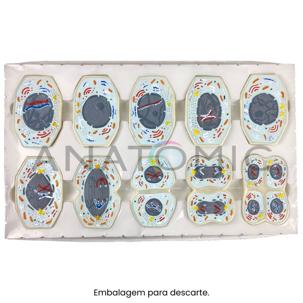 Modelo ampliando 10.000 vezes, apresenta conjunto com 10 peças, ilustrando os estágios da meiose; possui cores comuns da microscopia e relevo tridimensional. Confeccionado em resina plástica, modelos acomodados em base especial.