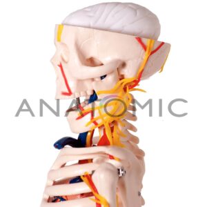 Modelo de esqueleto humano, medindo 85 cm, apresenta com riqueza de detalhes estruturas anatômicas com vasos sanguíneos, nervos, coração e cérebro. O lado esquerdo do esqueleto mostra o curso e distribuição dos nervos e das artérias dos membros superiores e inferiores.