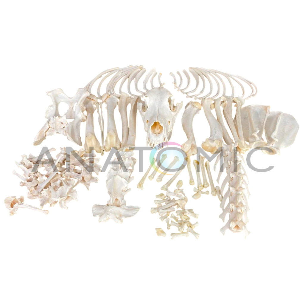 O esqueleto completo de um cão adulto de raça grande, desarticulado, é uma ferramenta de estudo e pesquisa em anatomia descritiva de ossos e articulações (osteologia e artrologia) de alta qualidade, ideal para estudantes e profissionais de Medicina Veterinária, Anatomia Comparada e áreas afins. Este biomodelo oferece uma visão detalhada e realística das estruturas ósseas e articulares, feito por meio de osteotécnica tradicional.