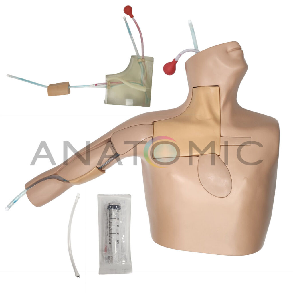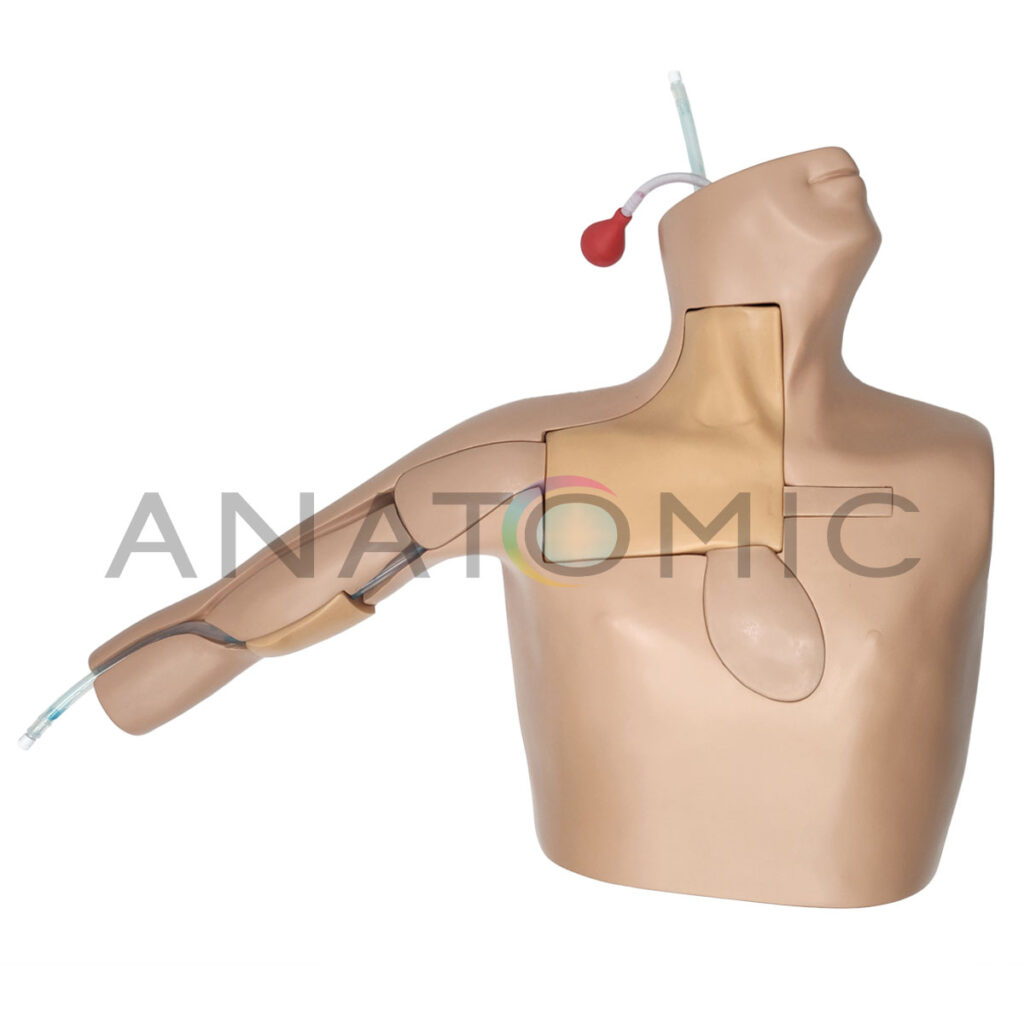 Simulador para Treinamento de Punção Venosa Central e Cateterismo Guiado por Ultrassom desenvolvido para aprimorar habilidades em procedimentos de punção venosa central e inserção de cateteres, apresenta um modelo anatômico da região do lóbulo da orelha ao plano umbilical, com a cabeça posicionada lateralmente. Construído com materiais de alta qualidade que garantem maior realismo, possuindo estruturas anatômicas como braço direito, clavícula, costelas, músculo esternocleidomastoideo, articulação esternoclavicular, veia jugular interna, veia subclávia e artérias correspondentes.