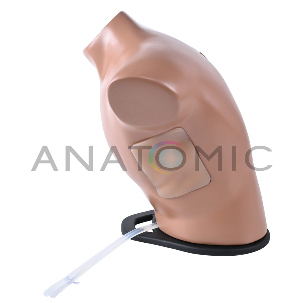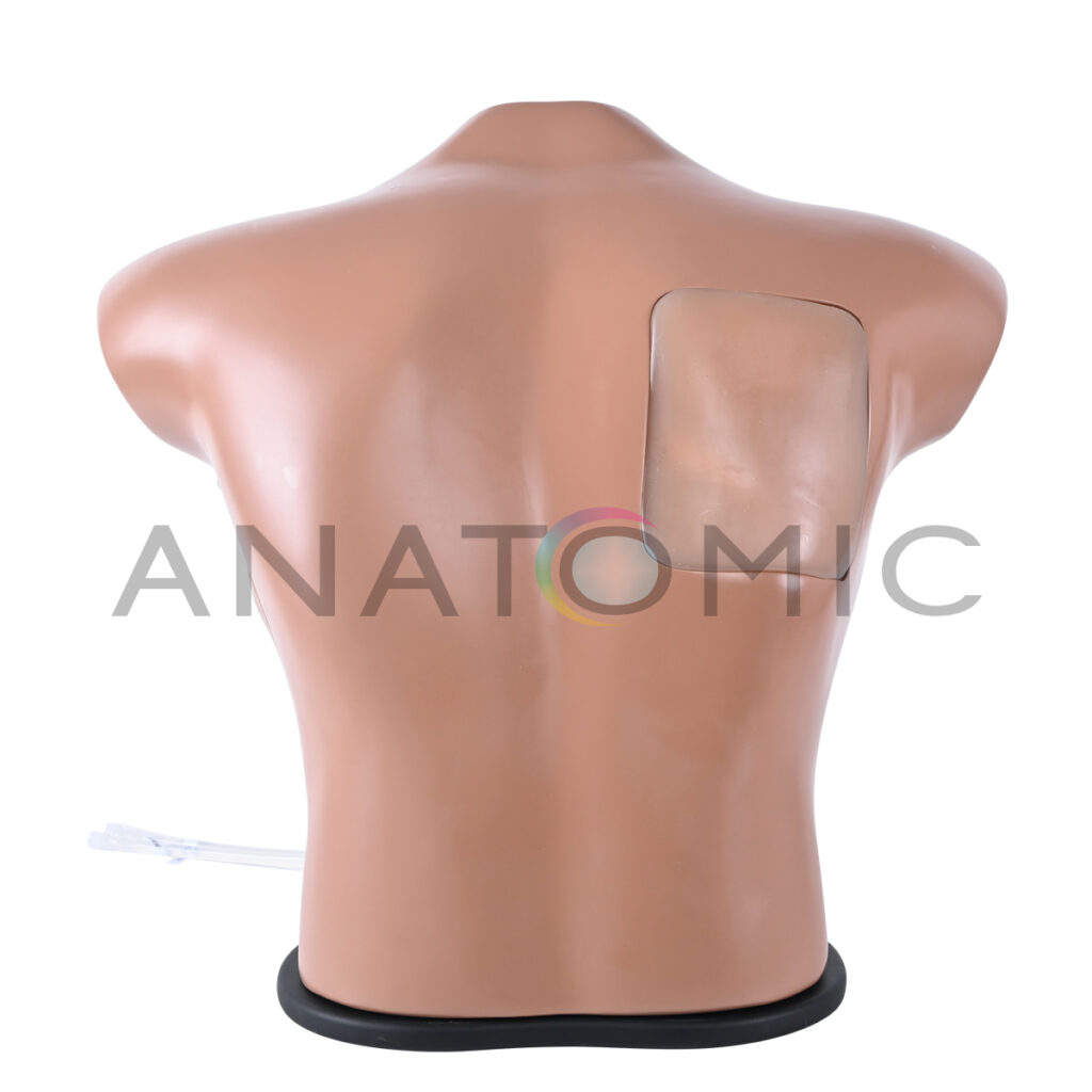 Modelo que exibe um torso humano realista, incluindo pele, tecido subcutâneo, parede torácica, costelas, pulmões, cavidade pleural, derrame pleural, diafragma e outros componentes anatômicos. O material apresenta propriedades acústicas e de densidade semelhantes às dos tecidos humanos, permitindo tanto punção cega quanto punção guiada por ultrassom. Proporciona suporte confiável para treinamento de toracocentese, utilizando pontos de referência de superfície e orientação por ultrassom.