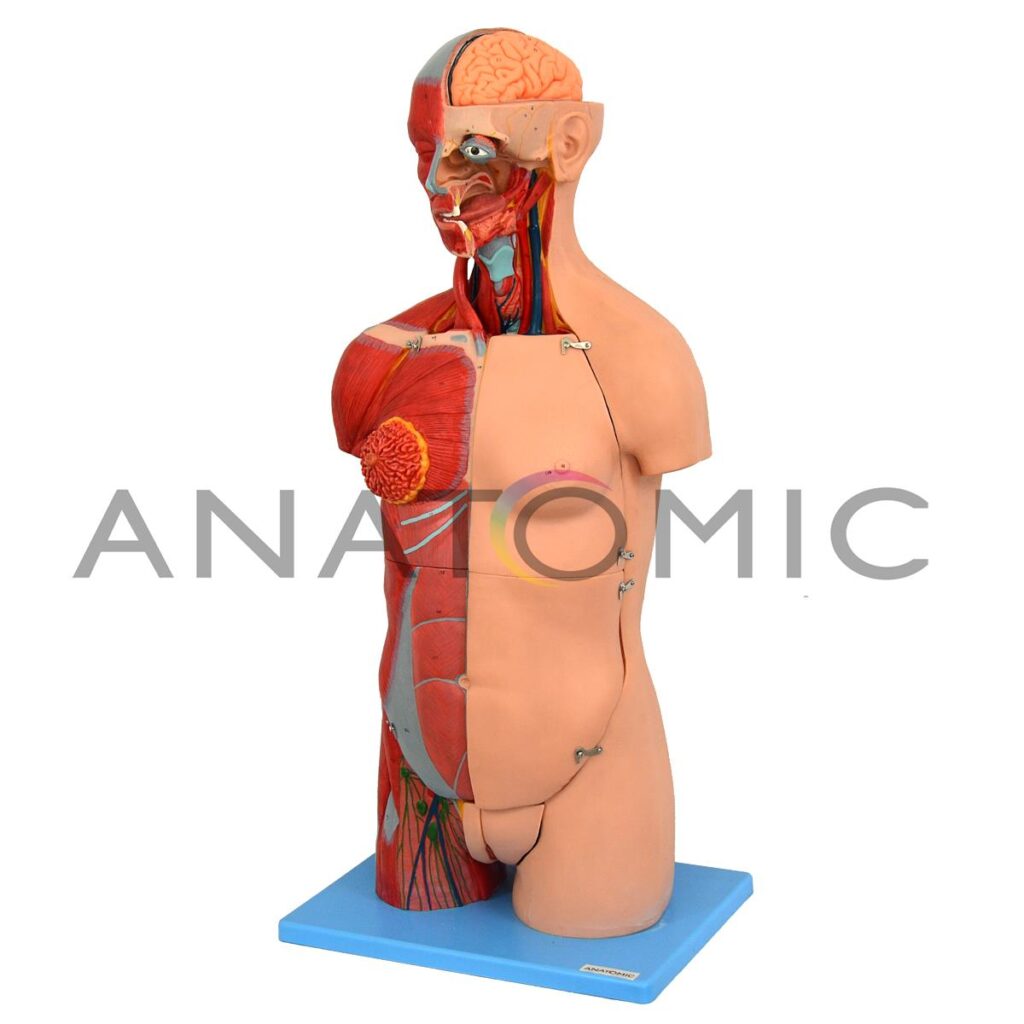 Modelo de torso de aproximadamente 85 cm, bissexual, com coluna exposta. Mostra com detalhes estrutura anatômica do corpo humano com órgãos, sistema de vasos sanguíneos, ossos, músculos e linfonodos.
